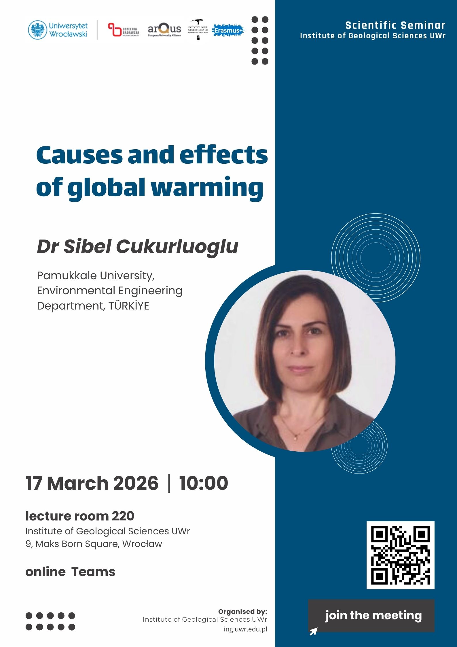 Serdecznie zapraszamy na Posiedzenie Naukowe Instytutu Nauk Geologicznych UWr, które odbędzie się we wtorek 17 marca 2026 r. o godzinie 10:00. Odczyt pt.: „Causes and effects of global warming” wygłosi Dr Sibel Cukurluoglu Pamukkale University, Environmental Engineering Department, TÜRKİYE